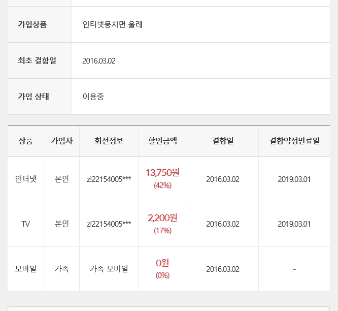 <인터넷뭉치면올레>로 배우자분 KT폰 1회선이 결합이 적용된 덕분에,
