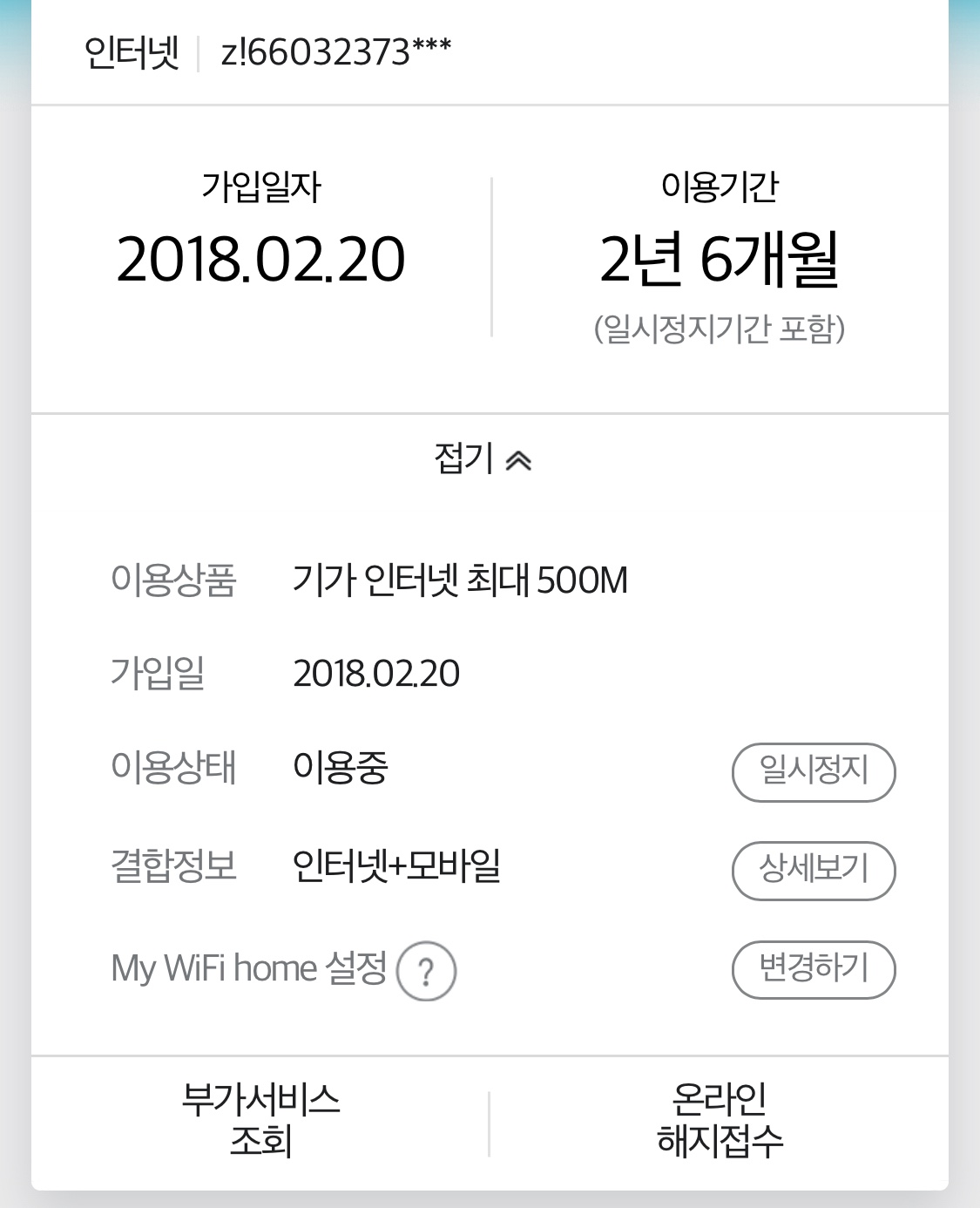 2018년 2월 20일에 KT 500메가급 인터넷 단독으로! 설치받으신 이력이 확인되네요~! 후후
