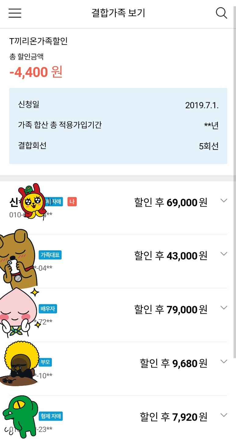 3. 가족분들 휴대폰 : SK폰만 총 5회선으로 -> 온가족할인 10년 이상 결합중 (+ 집 인터넷 포함~!)