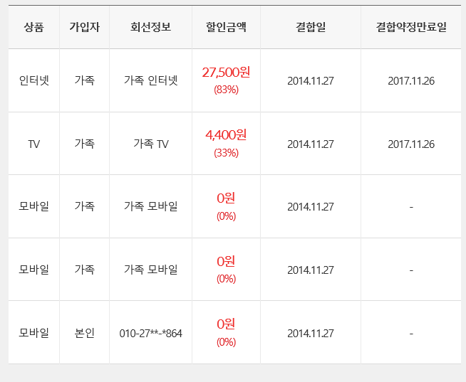 이번에 아버지가 결합이 안되어있는걸 확인하고 추가하려고 하다가 할인내역을 확인했습니다.(아래 사진과 같습니다)