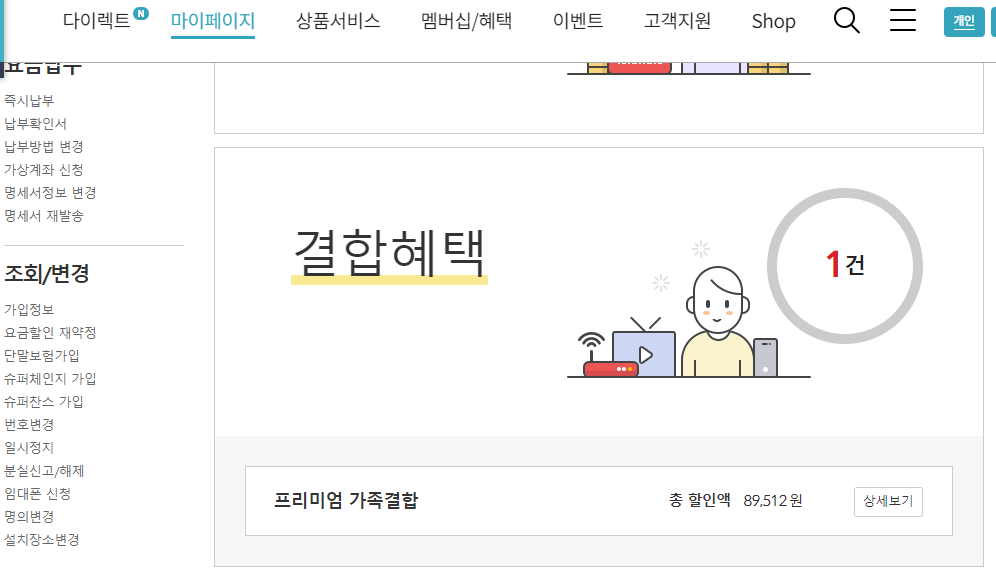 3) 좌측 [My혜택] 클릭하시면 아래 [결합혜택] 이라고 보이실 거에요