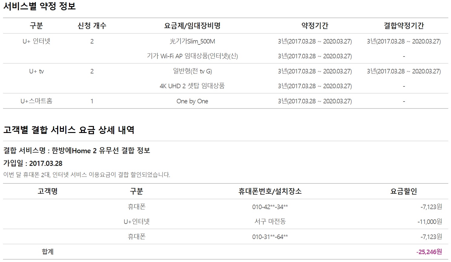 현재 LG 인터넷 + IPTV + IOT + 휴대폰 2회선을 결합하여