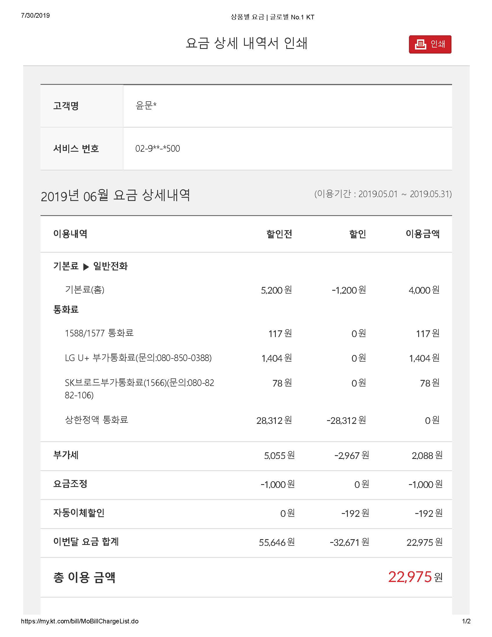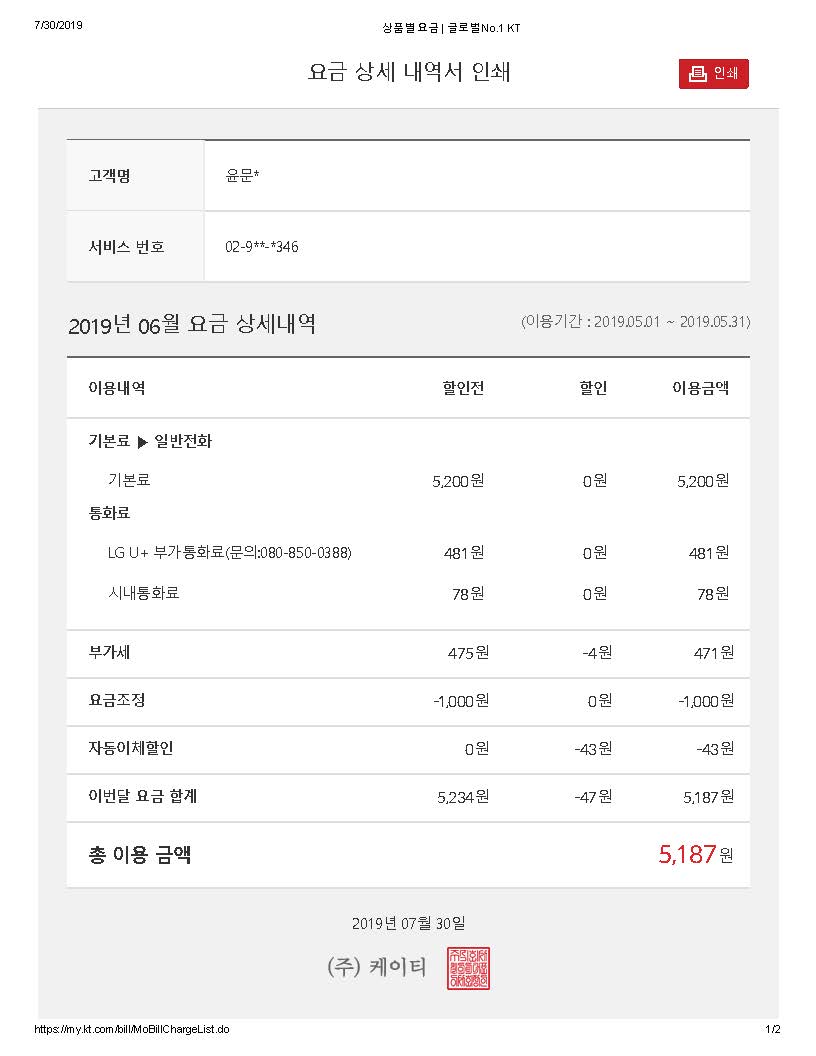 현재 KT를 사용하고 있으며, 사용중인 요금제 및 사용량(금액)은 다음과 같습니다.
