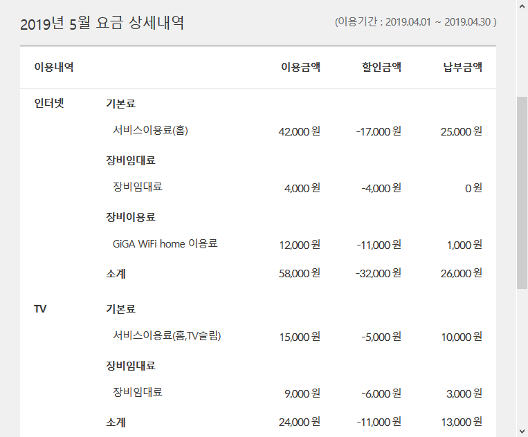 3년 전 500메가 인터넷, TV, 와이파이 계약 후 아래처럼 납부하며 사용하다 6월에 계약이 만료되는데요.