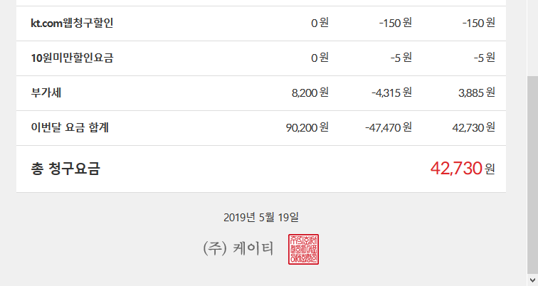 신용카드는 KB국민카드 KT Super DC7으로 매달 할인을 받으며 사용 중입니다.