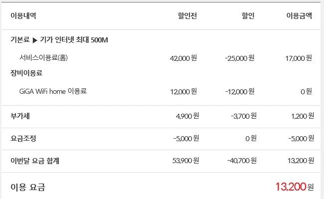 (인터넷 19,800원 + TV 15,400원)이 합산 청구됩니다.