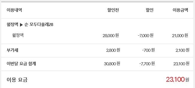 2. 다만, 핸드폰 약정할인(25%)은 장모님만 받고 계시네요ㅎㅎ