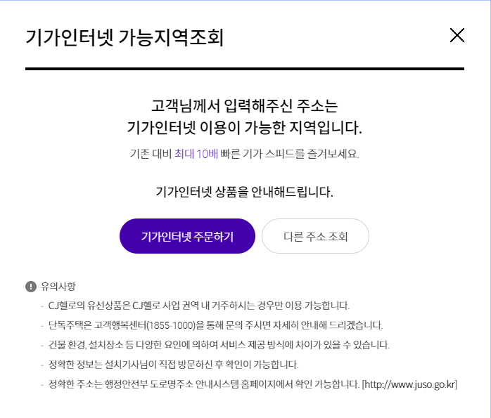 CJ HELLO 홈페이지에 가면 인터넷 상품 중 기가인터넷이 있는데요.