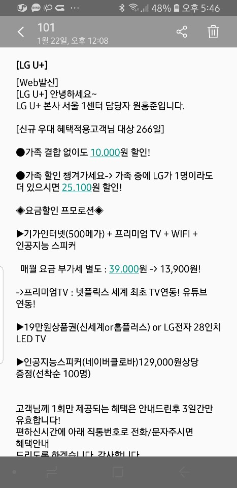 근데 오늘 유플러스 본사에서 연락이 왔던데 이게 맞는내용인지도 궁금해서요.