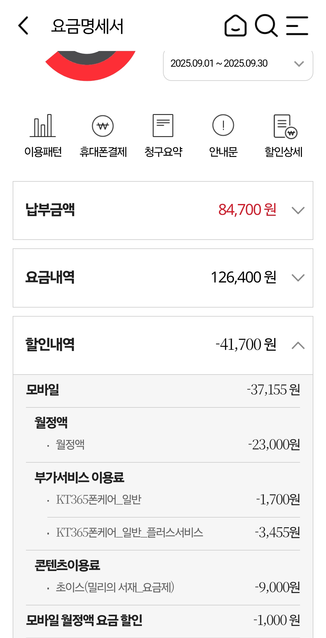 가족 결합된 분의 요금은 84700원이 나왔습니다.