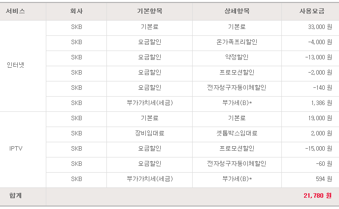지금 현재 SK브로드밴드와 SK텔레콤 사용내역은 아래와 같습니다.