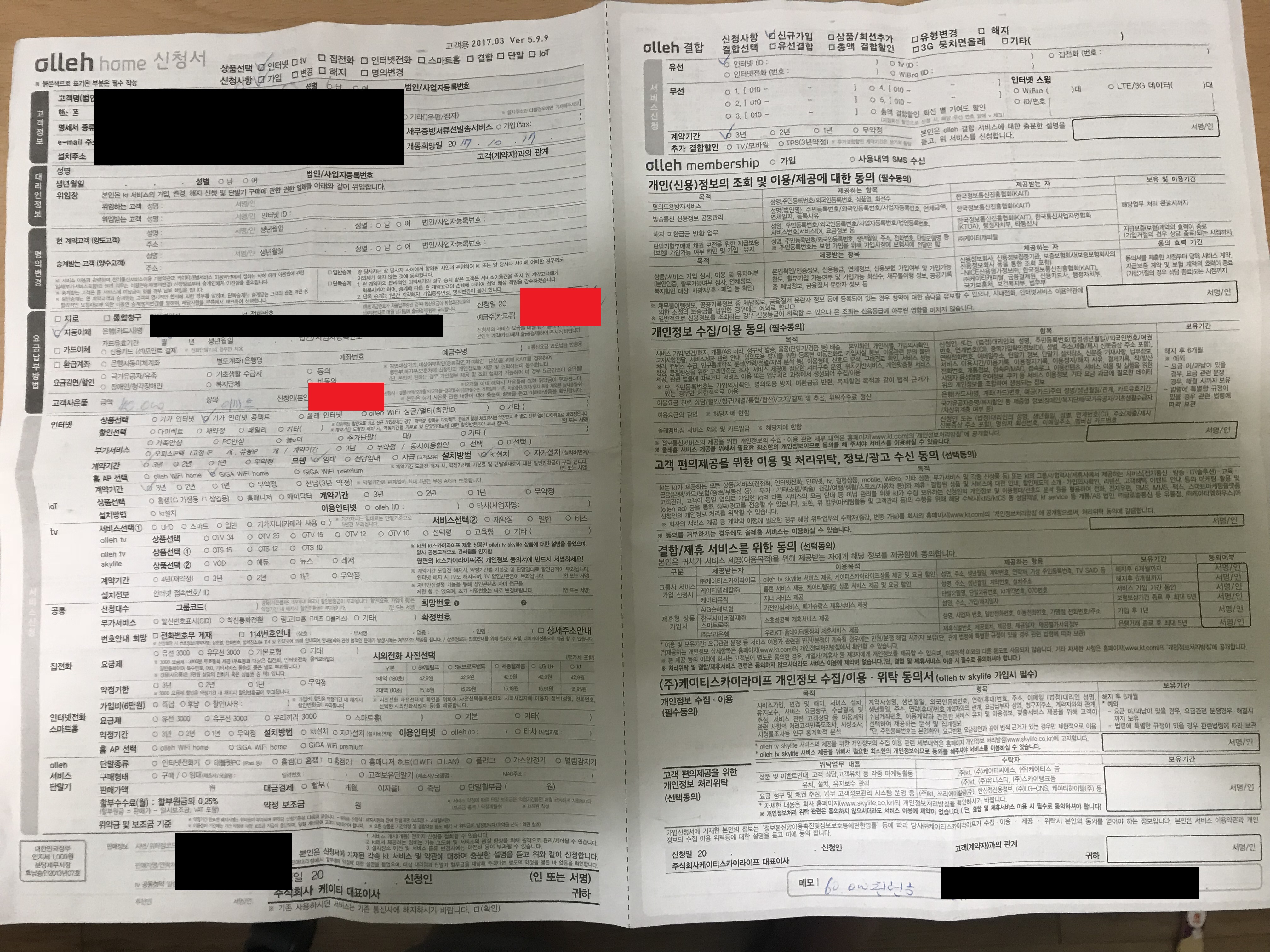 계약서에 고객정보와 요금납부방법 외에는 서명한곳이 없습니다 사진상 빨강으로 된곳만 서명이 들어간 상태입니다