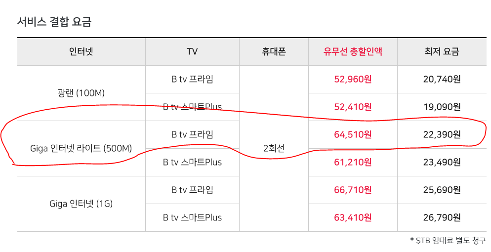 휴대폰 2회선 있으면  '기가 라이트(500M) + TV'가 22,390원으로 나오는데요~