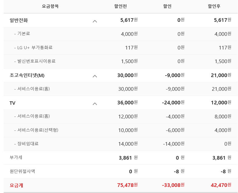 인터넷 23,100원 + 일반전화 6,200원 + TV 8,800원 + 추가 TV 4,400원