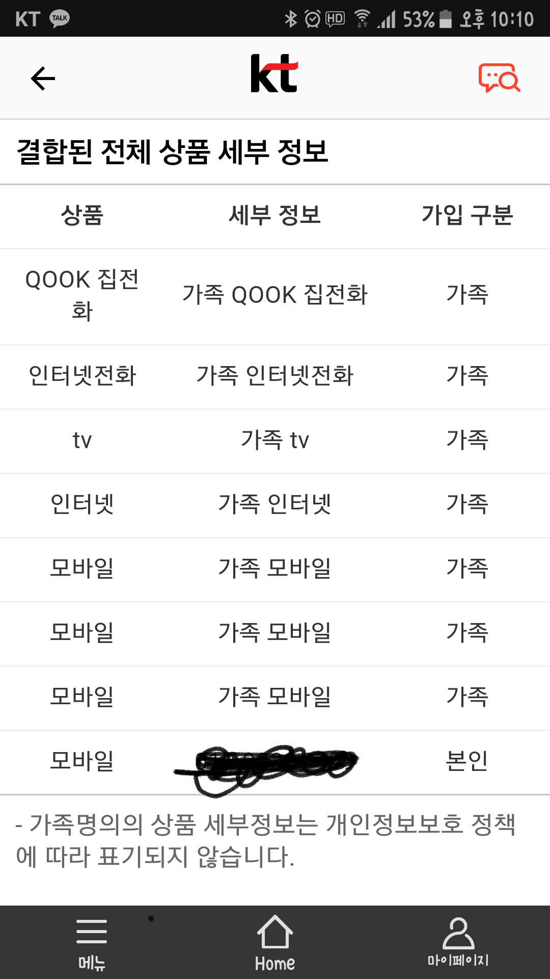그런데 제 휴대폰은 저희집이 아닌 부모님 댁과 결합되어 있는 것 같은데... 사진으로 확인해 주시겠어요? (인터넷+집전화+인터넷전화+tv+모바일)
