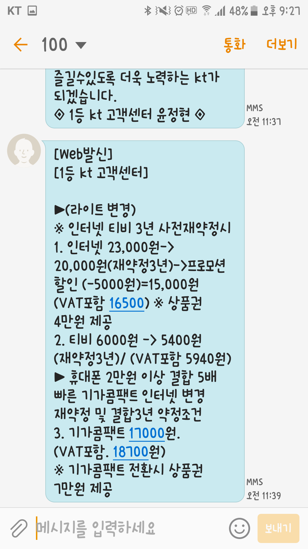 2. KT에서 제시했던 요금할인 및 사은품 혜택 문자메시지 캡쳐본으로 보여드려요.