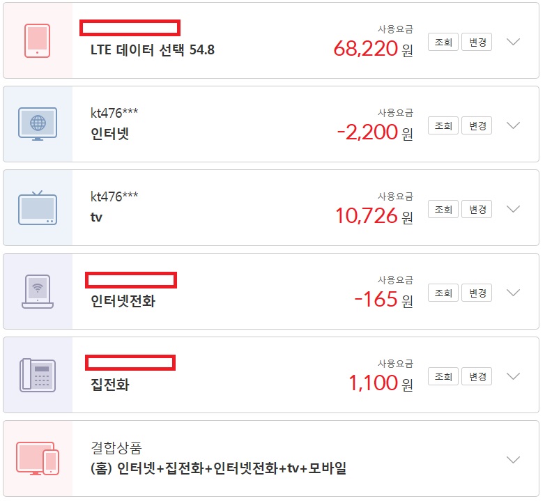 요금할인을 받아 KT인터넷과 TV 그리고 집전화를 사용중이군요