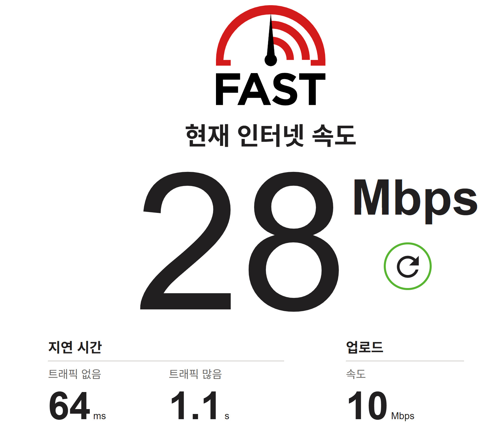 결과가 다운로드 28Mbps / 업로드 10Mbps, 지연시간(핑)도 60ms 이상으로 표시되네요