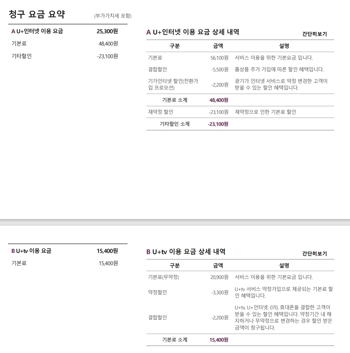 제가 지금 월납부 하고 있는 요금은 아래와 같고