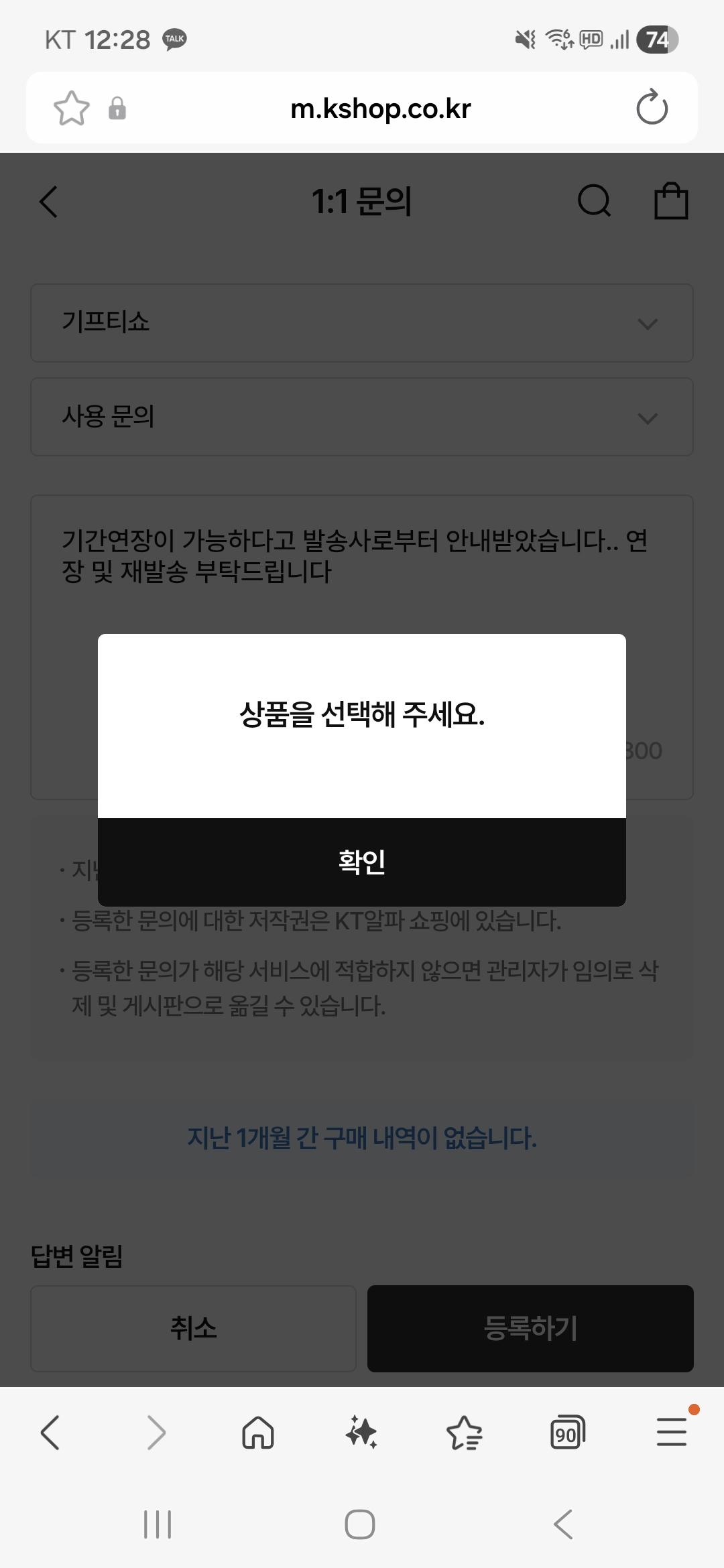 @스****아이고.. 1:1 문의하기에서 글 등록하기가 되지 않으면 KT 기프티쇼에 전화로 요청하는 방법 뿐입니다 😢 크흡...