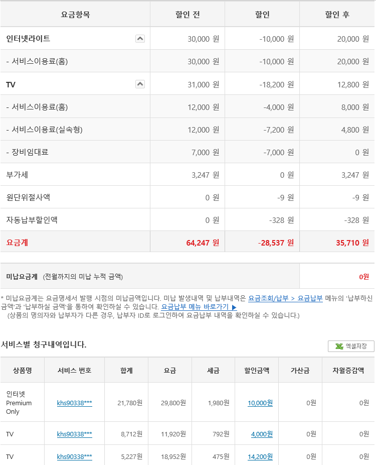 현재 나가는 인터넷+iptv2대의 요금입니다.