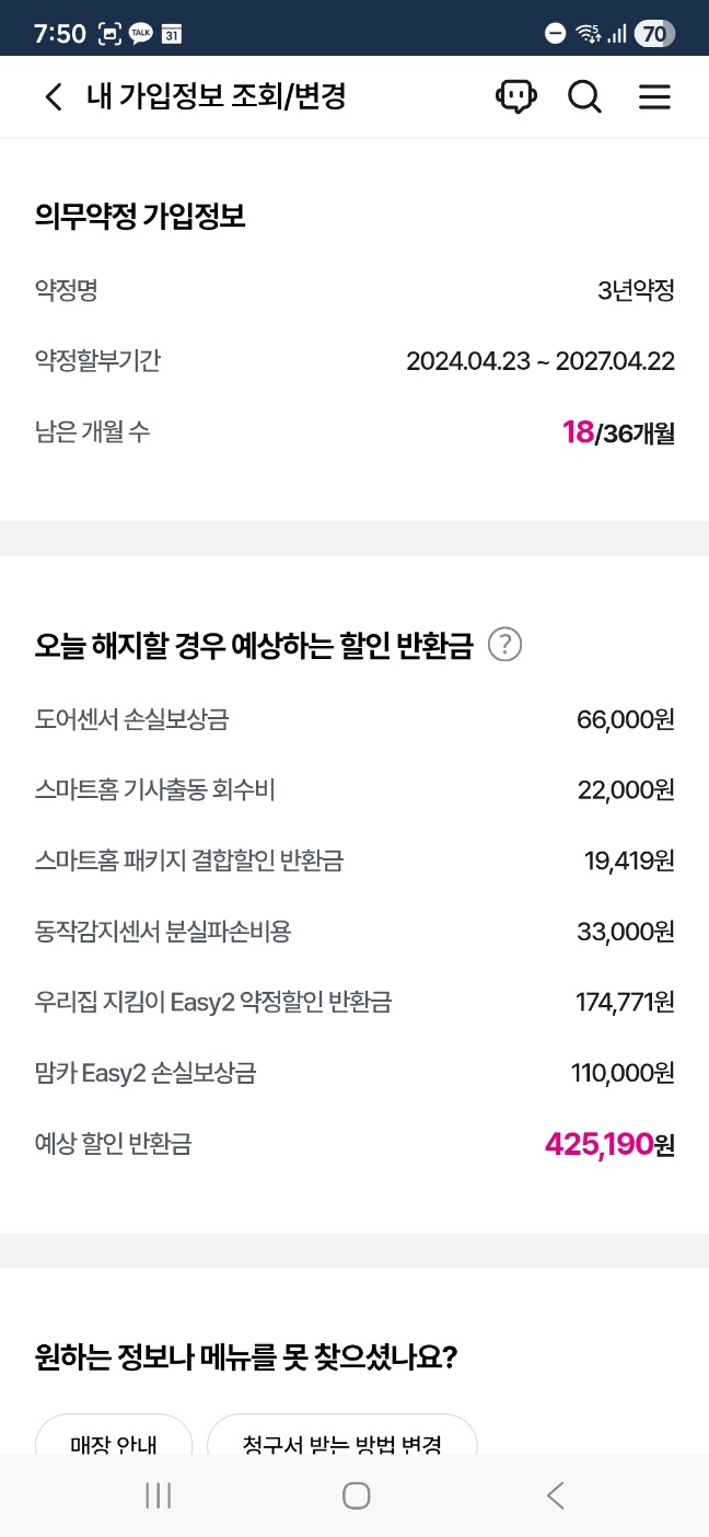 IPTV와 스마트홈 할인반환금 조회 화면 첨부합니다