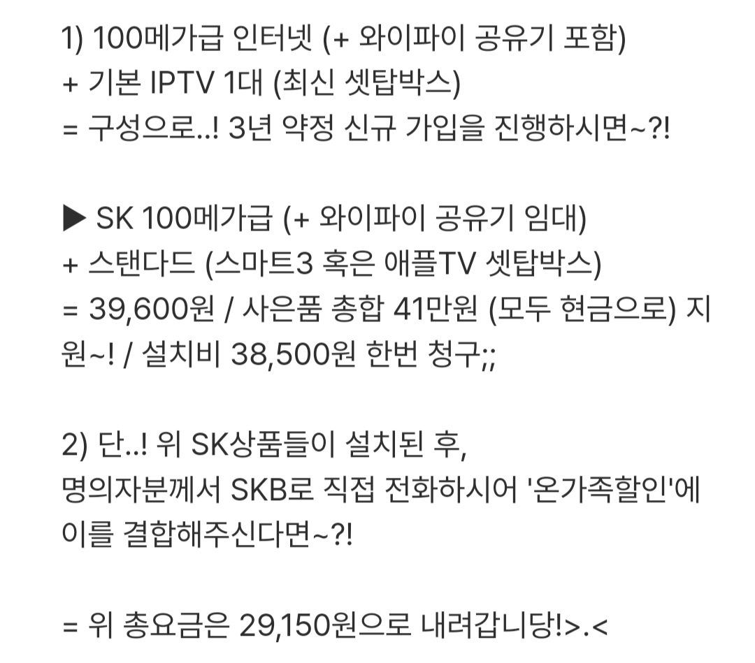 : 타사 인터넷 신규 가입 조건과 / SK 인터넷 재약정 조건을 비교해보실 필요가 있고요~!