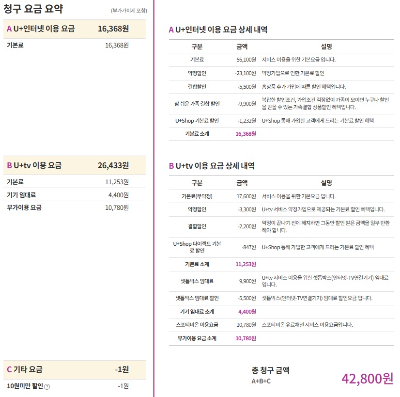 와이파이 필요하고 티비도 기본채널 정도면 될 듯 합니다.(아빠가 가끔 스포츠채널을 보셔서 부가서비스로 스포티비온(10,780원/월) 결제중이긴 합니다.)