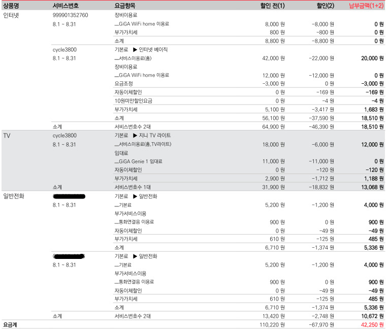 KT 인터넷 베이직요금제(500M)+와이파이+티비(기가지니) 1회선+유선전화 2대+KT 모바일 1회선(실버요금제 33,000) 결합이용으로 42,250원 납부하고 있습니다.
