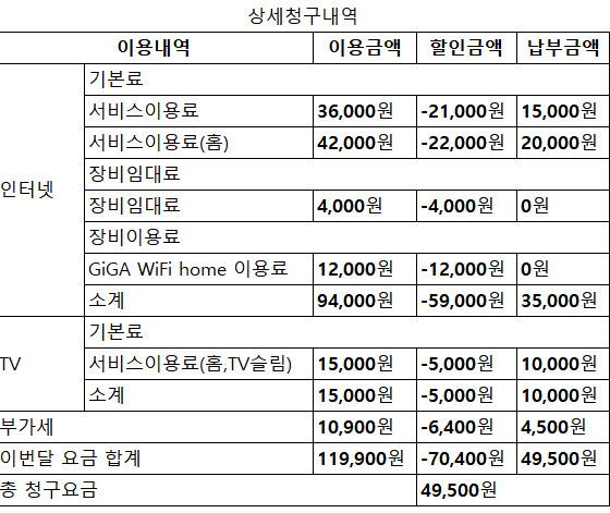 인터넷 요금을 봤을 때 할인을 받고 계신 듯합니다만 확실하게 체크하기 위해 여쭙습니다!