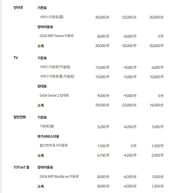 500메가 인터넷+와이파이 공유기 2대+TV 2대+일반전화를 사용 중이시네요!
