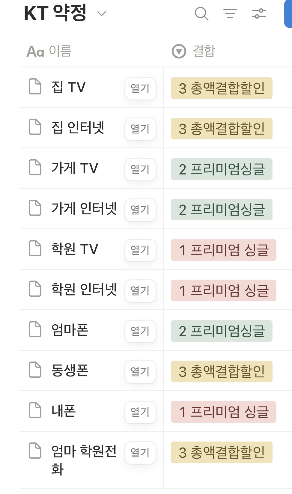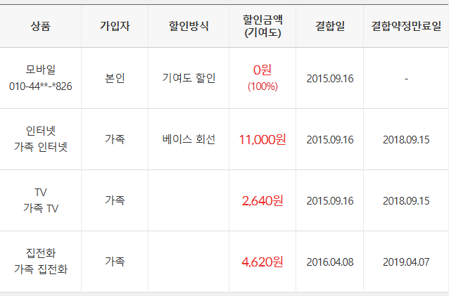 현재 가족 명의 모두 합쳐 KT 이용내역은 아래와 같고