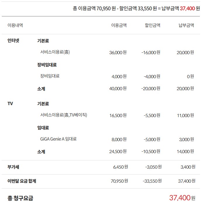 100메가 + 상위 티비 1대 = 합쳐서 월요금이