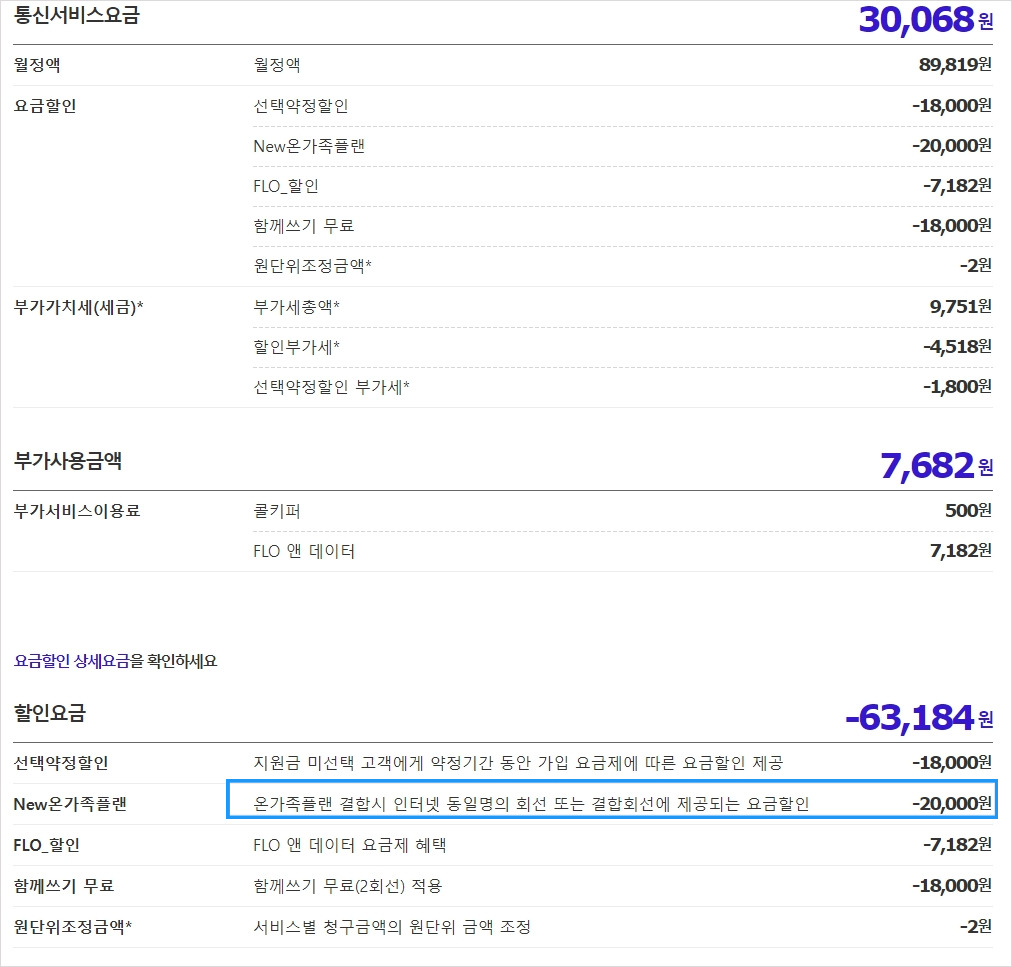 이렇게 요금을 내고있고 SKT휴대폰결합으로 월 2만원 가량 추가할인을 받고 있습니다
