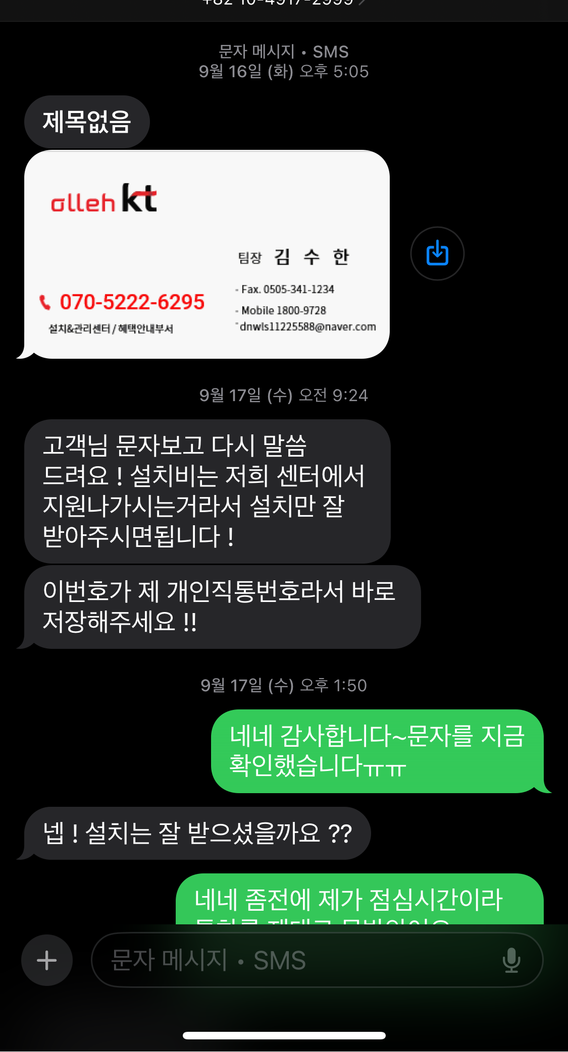 KT 계속 쓰고 있었는데 KT직원이라면서 보조금 28만원 준다고 1년만 유플 쓰라고 했습니다. 이때 보조금 28만원도 월에 낼 돈에서 할인되는 금액 일부를 대신 돈으로 준다고 했구요 유플 설치비도 자기 대리점에서 지원해준다고 하셨구요 기사님 오셔서 유플러스 기계 설치하고 다음달에 설치비도 빠져나갔습니다 설치비는 다시 반환처리 한다고 했는데 아직까지 입금이 안되고요 근데 KT를 사용안하니 돈이 안나가는줄 알았는데 통장을 확인해보니 KT+유플 둘다 돈 나가고있었고 유플 돈도 달에 나가는 돈이 다르길래 고객센터에 문의해보니 그거 이중가입 사기인거 같다고 하셨구요 그리고 유플러스 내던 금액 달마다 달랐던게 제가 500메가 상품에서 1기가로 바꿨다고 하시더라구요 저는 바꾼게 없는데.... 케이티에도 당연히 민원접수했고 저랑 통화하고 문자 나눈 대리점 직원은 잠수를 타셨습니다. 지난번 통화 때 직원분께서 제가 돈이 이중으로 나간걸 인지하고 전화통화 했을 때 이중으로 나간거 금액 계산해서 입금처리 해줄거고 금액 알려주신다고 해놓고 그것도 안알려주시고요 저는 지금 세달동안 이중으로 나가고 있었습니다 너무 화가나구요 저 명함도 자세히 보니 이메일주소 이름은 우진이고 명함 자체도 이상하네요 유플측에 말하니 가입시킨 대리점에 자기들이 연락을 할테니 대리점에서 전화가 오면 잘 따지라는 소리만,,,휴,,,