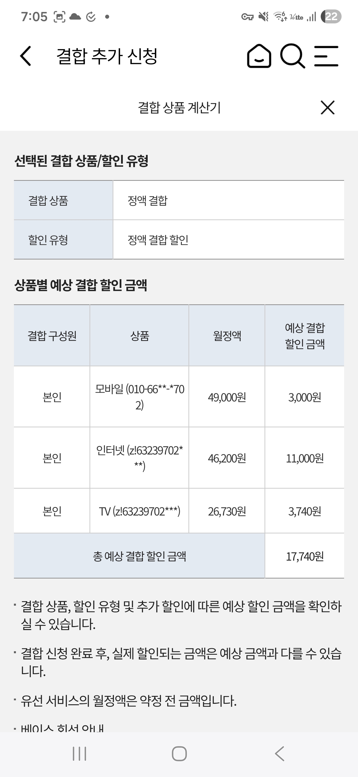 - 인터넷과의 결합 할인 3,000원 적용되어,