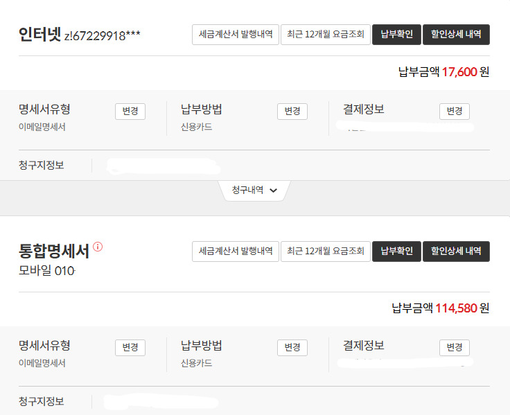 모바일: 요고 30 / 인터넷 1회선(z!61083134***): 베이직 (500mb) / 인터넷 2회선(z!67229918***): 슬림 (100mb)