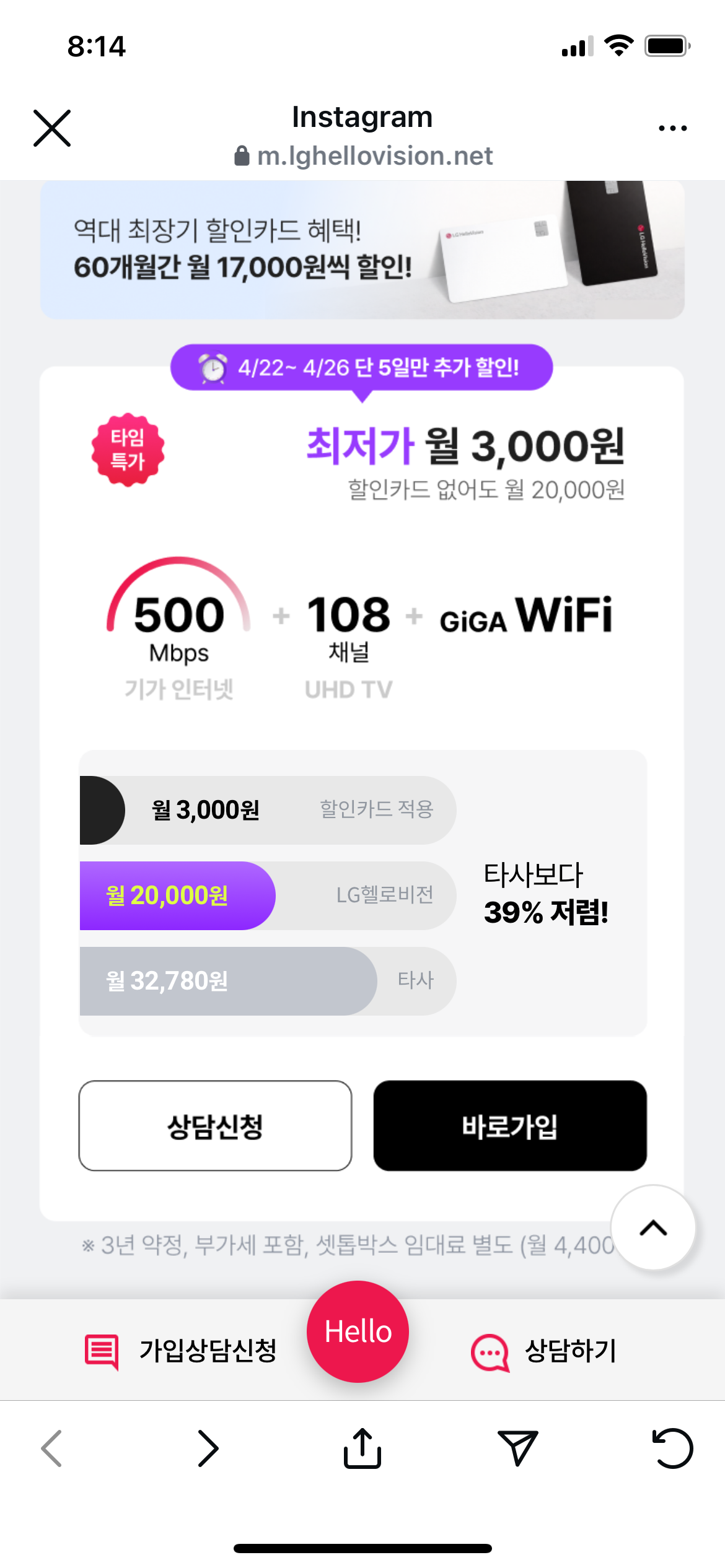 sk브로드밴드쓰다가 약정끝나서 백메가 상담받고 상담원과 통화해서 상품권 받고 다시 1년 약정해서 쓰고 이번에 끝났습니다. 인터넷+티비해서 매달 3만원씩 나가는데 와이파이 주로 사용하고 티비를 잘 보지 않아 최소 요금제로 갈아타고 싶어서요. 광고가 뜨는데 lg헬로우비전에서 인터넷+티비 2만원 상품이 있더라구요. 이걸로 갈아타도 괜찮을지 문의드리고 싶습니다.
