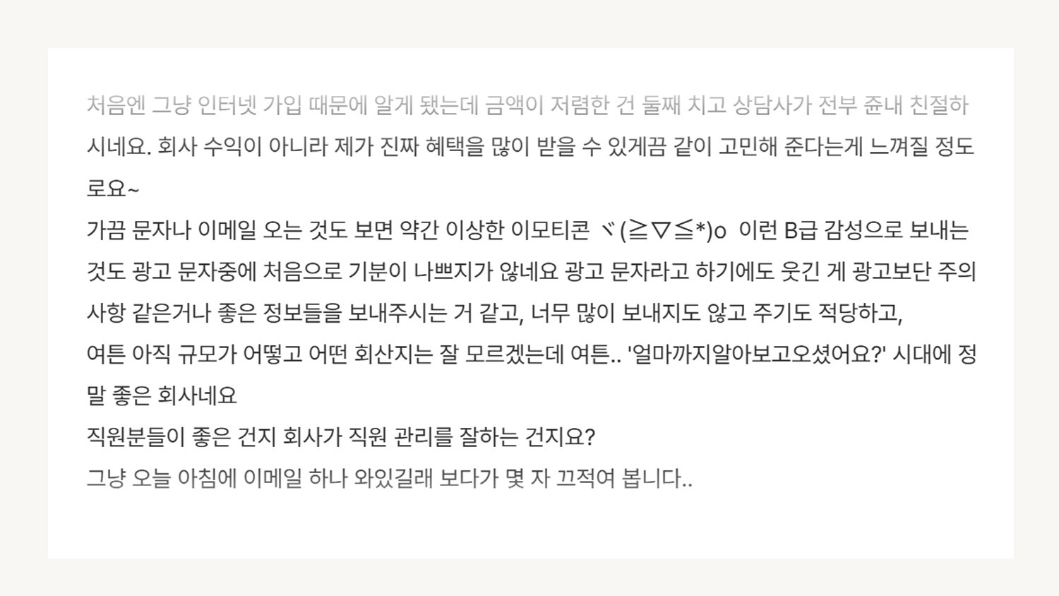강제로 높은 요금제를 권유하고, 인정에 호소하는 등 고객님을 불편하게 해드릴 일은 절대 만들지 않아요. 무엇보다… 사후 서비스가 저희의 자랑입니다. 😎